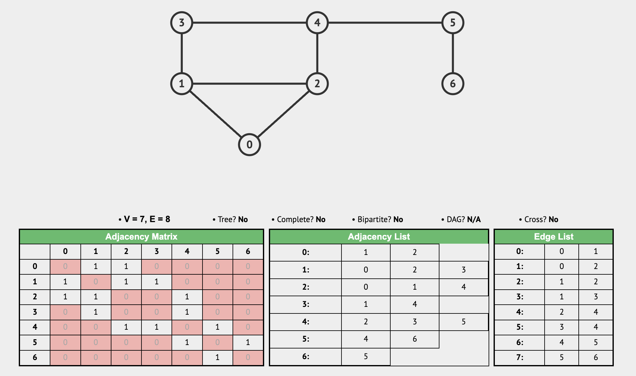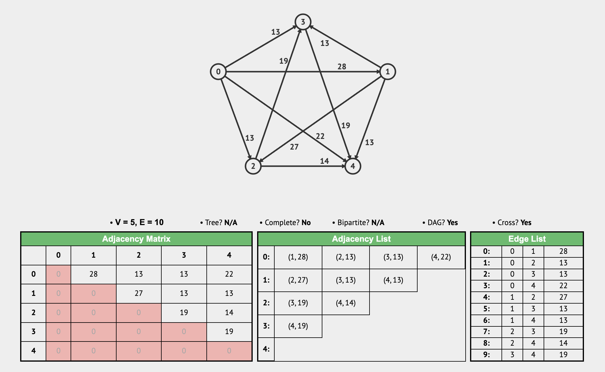 - A two-dimensional matrix, in which the rows represent source vertices and columns represent destination vertices