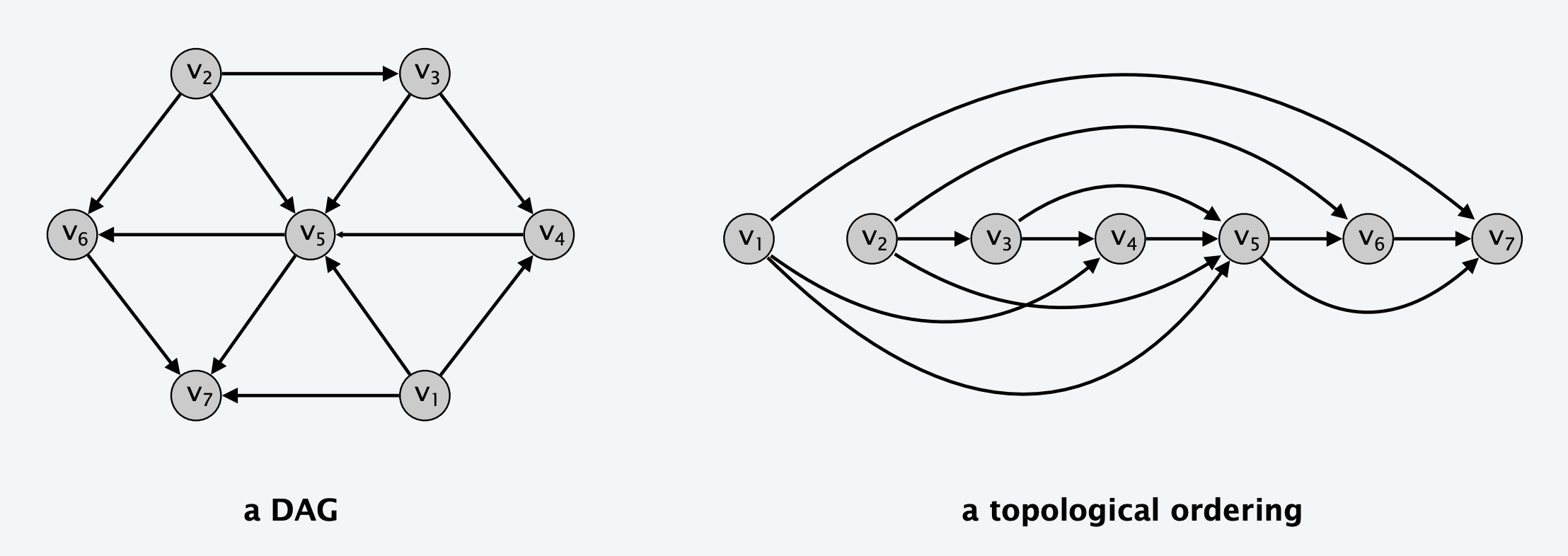 - A topological order of a directed graph G = (V, E) is an ordering of its nodes as v1, v2, …, vn so that for every edge (vi , vj ) we have i < j